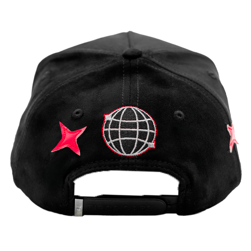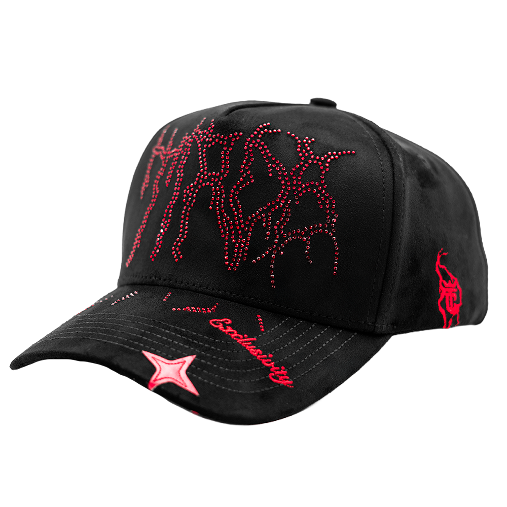 Gorra que destaca por sus bordados detallados , en tonos negro y rojo, acompañados de pedrería roja brillante.